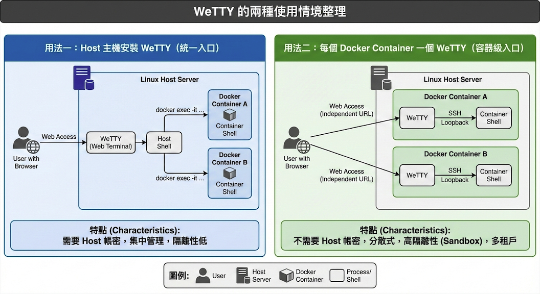 | 項目 | 用法一:Host 安裝 WeTTY(統一入口) | 用法二:每個 Container 一個 WeTTY |