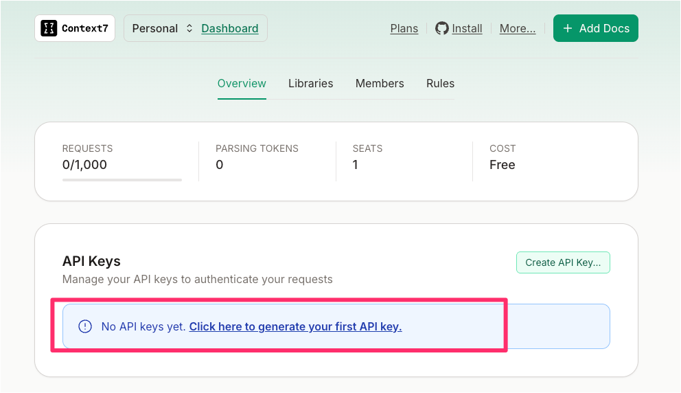 - 如果你是第一次進入,下方會出現「Click here to generate your first API key」。