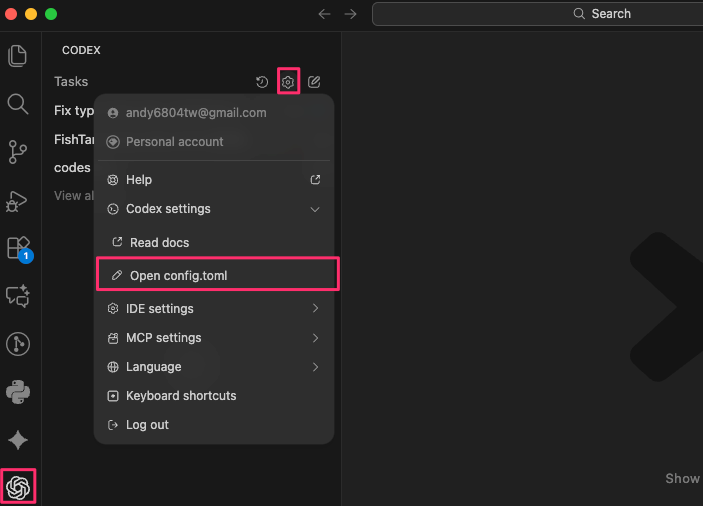 - 回到我們的 VS Code,打開 Codex,然後點選設定。