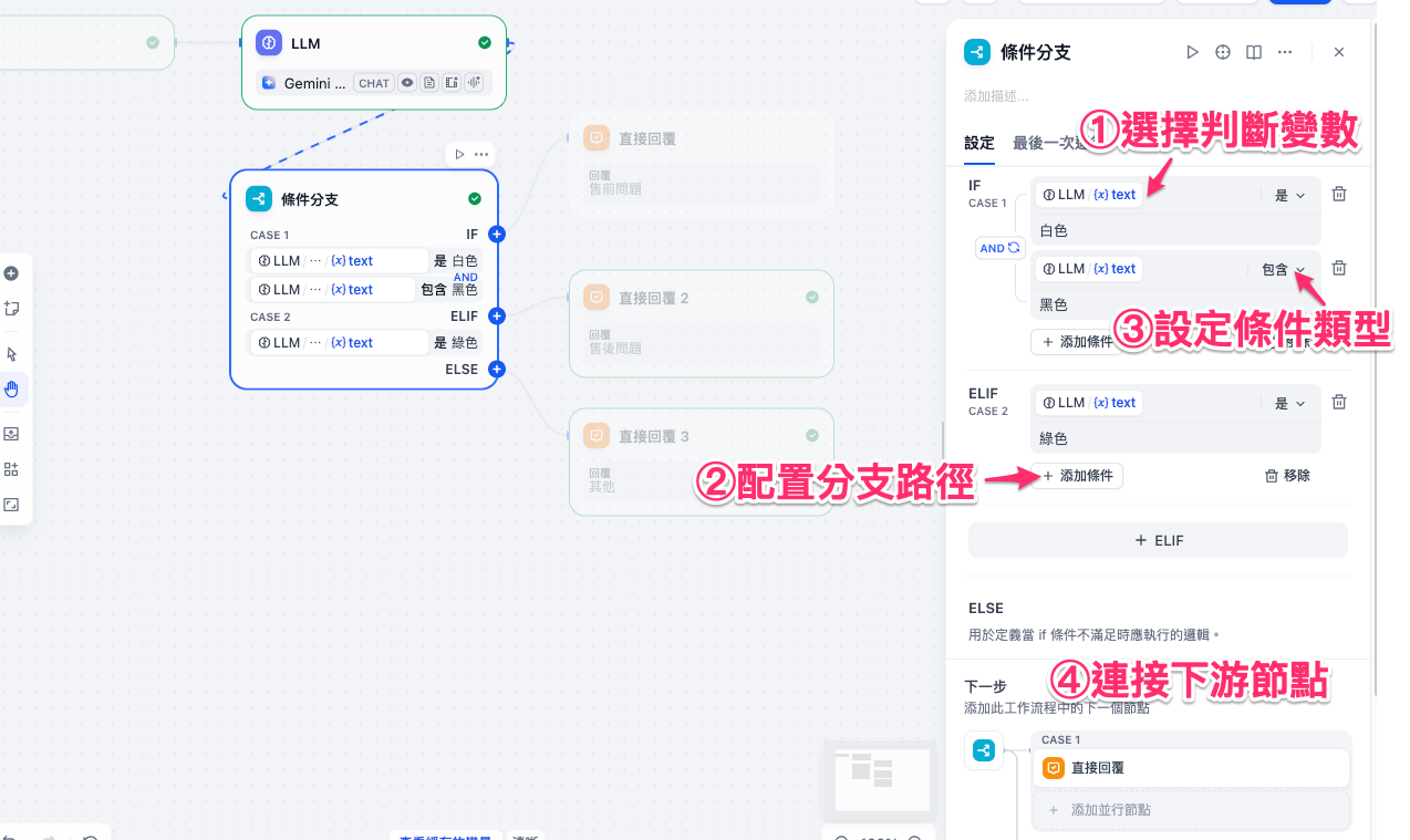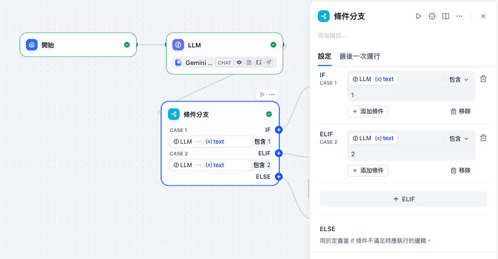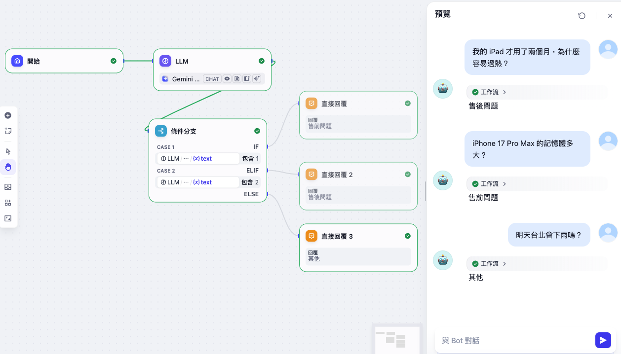 - 搭配大模型輸出:條件分支不只比對字串,也能利用 LLM 輸出的結果(例如:分類標籤或數字),再透過分支節點進行判斷。