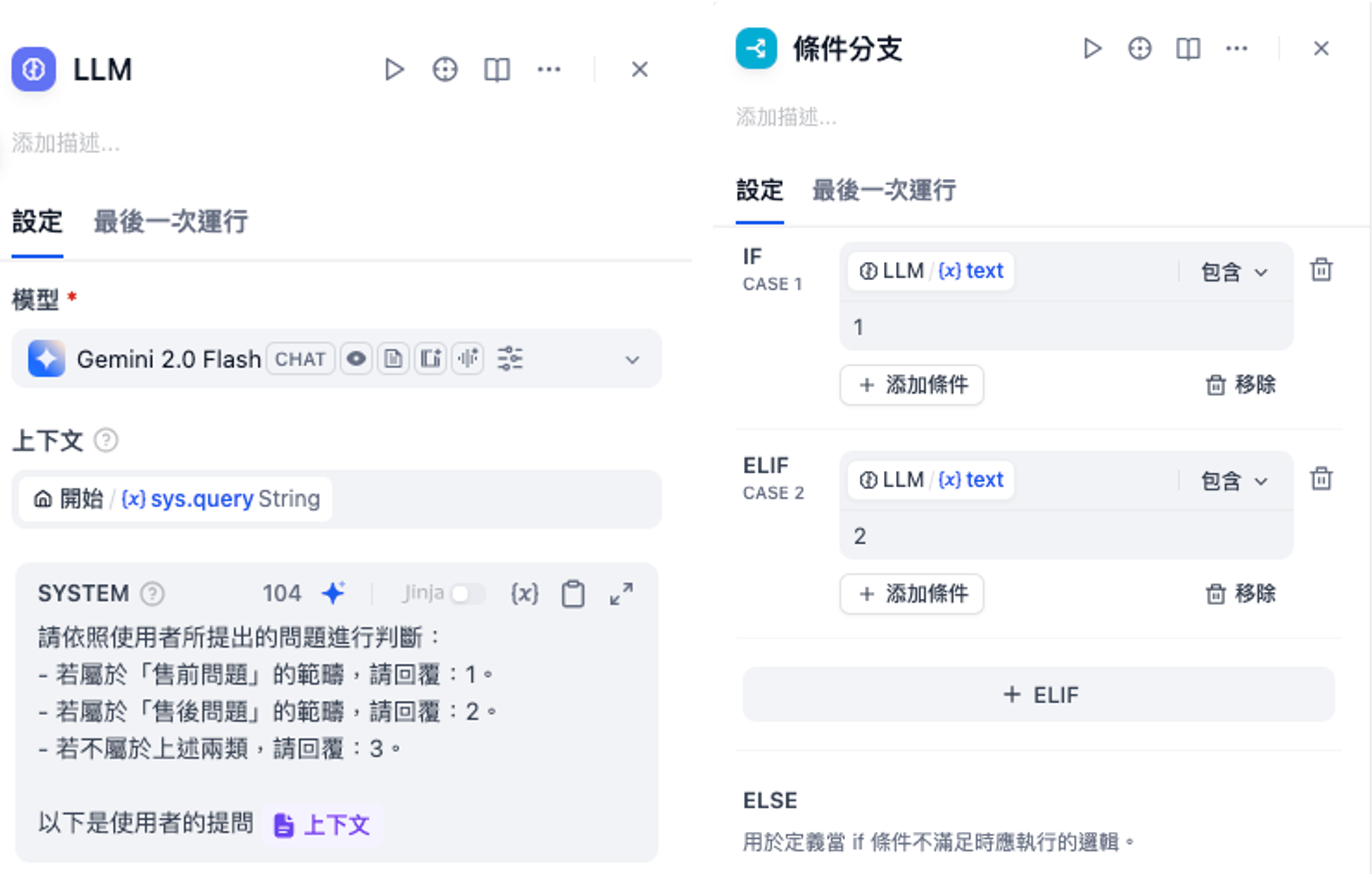 透過這樣的設計,條件分支 能自動幫助系統做出正確的流程分流,並與 問題分類器 搭配使用。 不同的是,問題分類器偏重於依靠 LLM 的語意理解 來做分類;而條件分支則偏重於 規則邏輯判斷,兩者結合能讓工作流既聰明又可控。