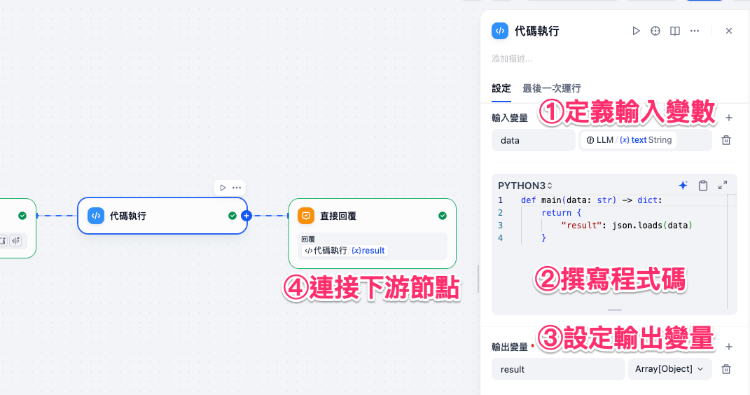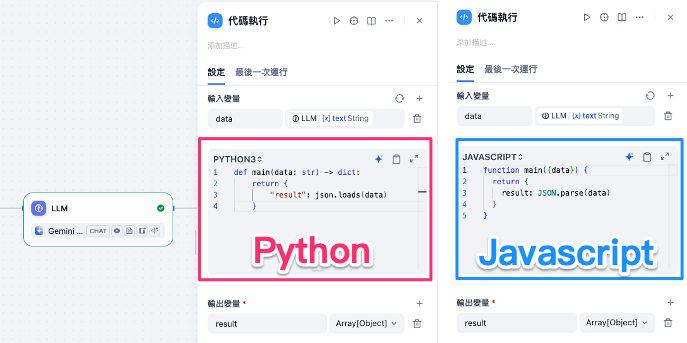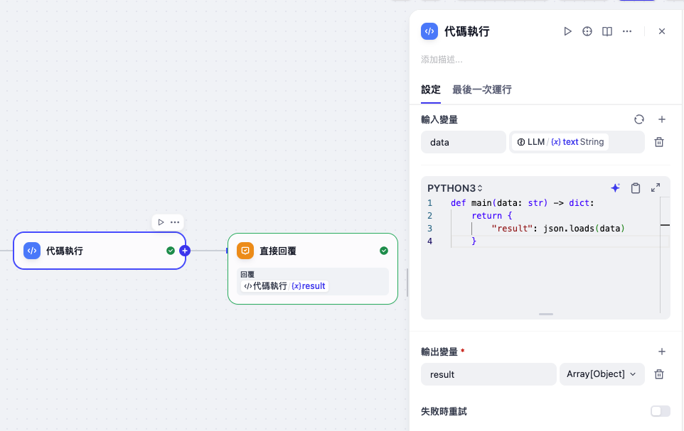 在 程式碼執行節點 中,我們要做的事情就是把 LLM 的字串輸出轉換為 JSON。