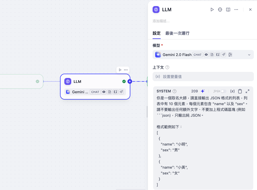 在 LLM 節點中,我們讓模型輸出一份模擬 API 回傳的資料。這裡要求模型產生 10 個人名與性別: