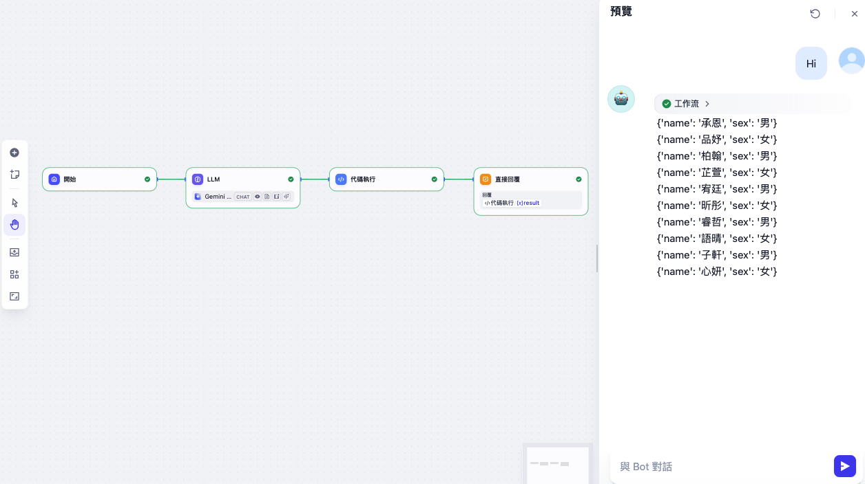 透過這樣的流程,程式碼執行 能幫助我們將 LLM 的文字輸出轉換成結構化資料,方便後續節點進行運算或直接回覆,大幅提升工作流的靈活度與可控性。