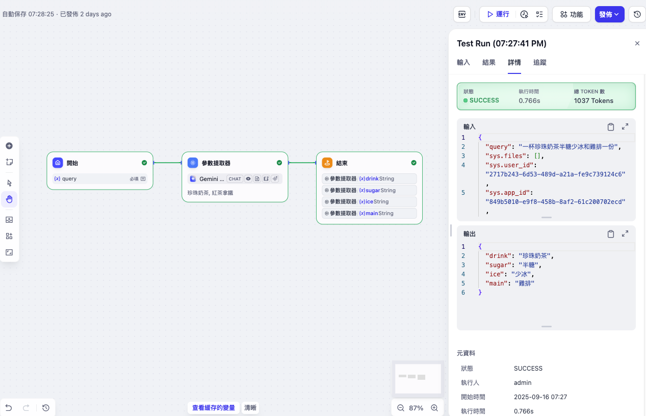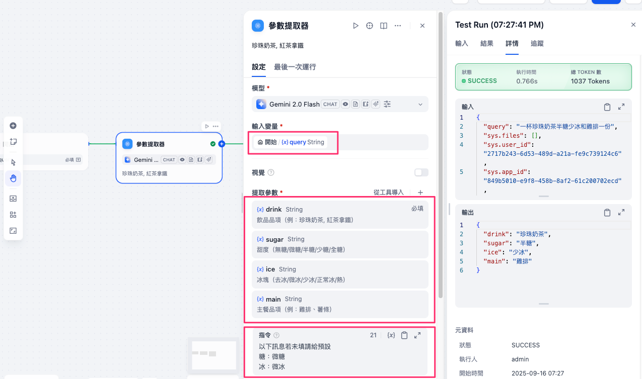 目標:從一句自然語言點餐(例:「一杯去冰少糖的珍奶和一份雞排」),自動抽出結構化參數:飲品 drink、甜度 sugar、冰塊 ice、主餐 main。完成後把流程 發布為工具 (Workflow as Tool),在其他專案重用。