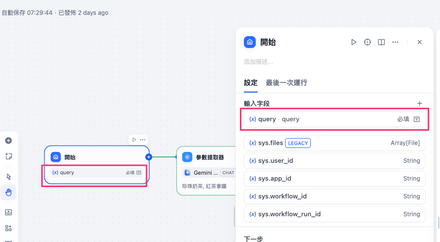 - 新增 LLM 節點並命名「參數提取器」;模型可用 Gemini 2.0 Flash (CHAT)(或任一支援結構化輸出的模型)。