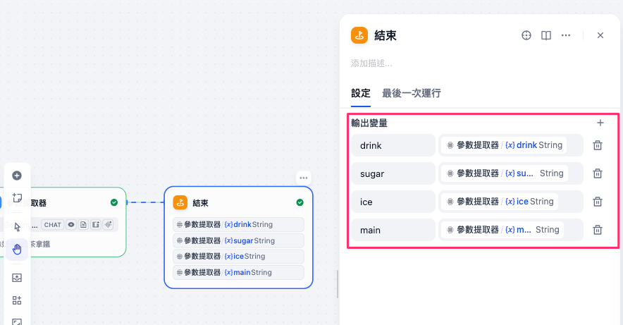 - 在任一新流程,插入 工具節點 → 選 Parameter Extractor(點餐)。
