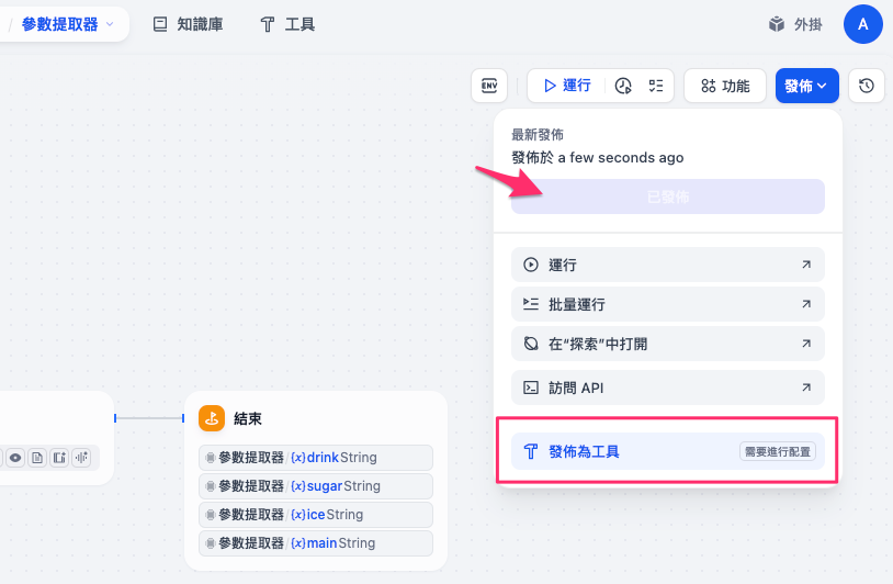 教學實作:將工作流發佈為工具(參數提取器|點餐範例)