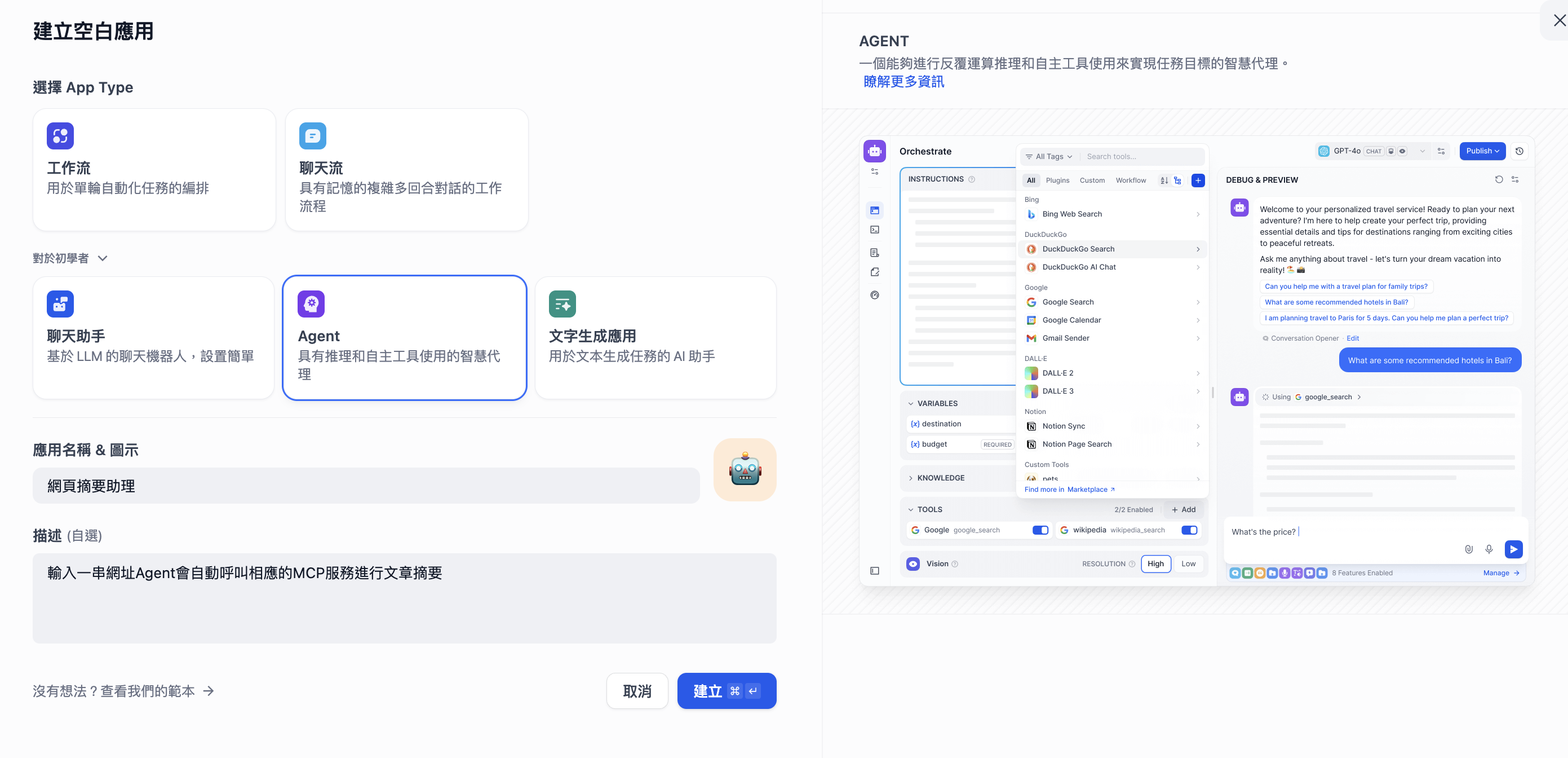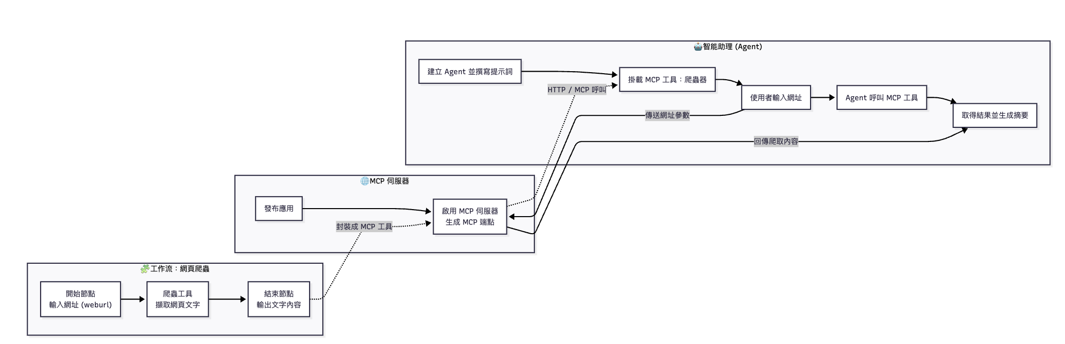 完成 MCP 伺服器的設定後,我們就可以建立一個能夠呼叫它的 Agent。這個步驟能幫助我們在對話介面中直接測試爬蟲結果,並驗證 MCP 服務是否正常運作。