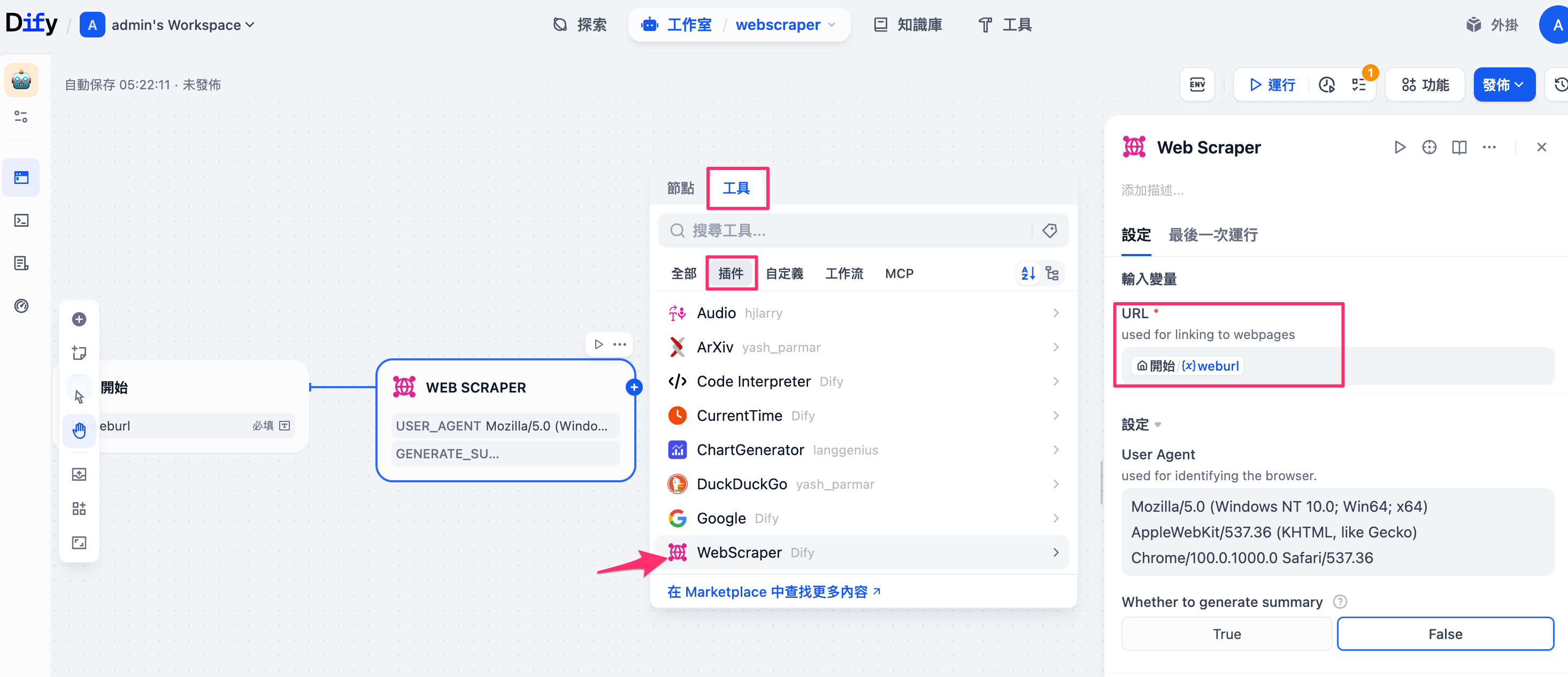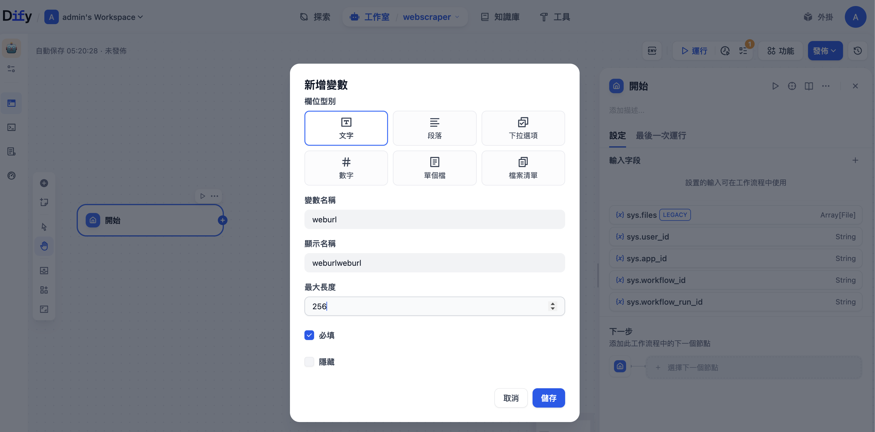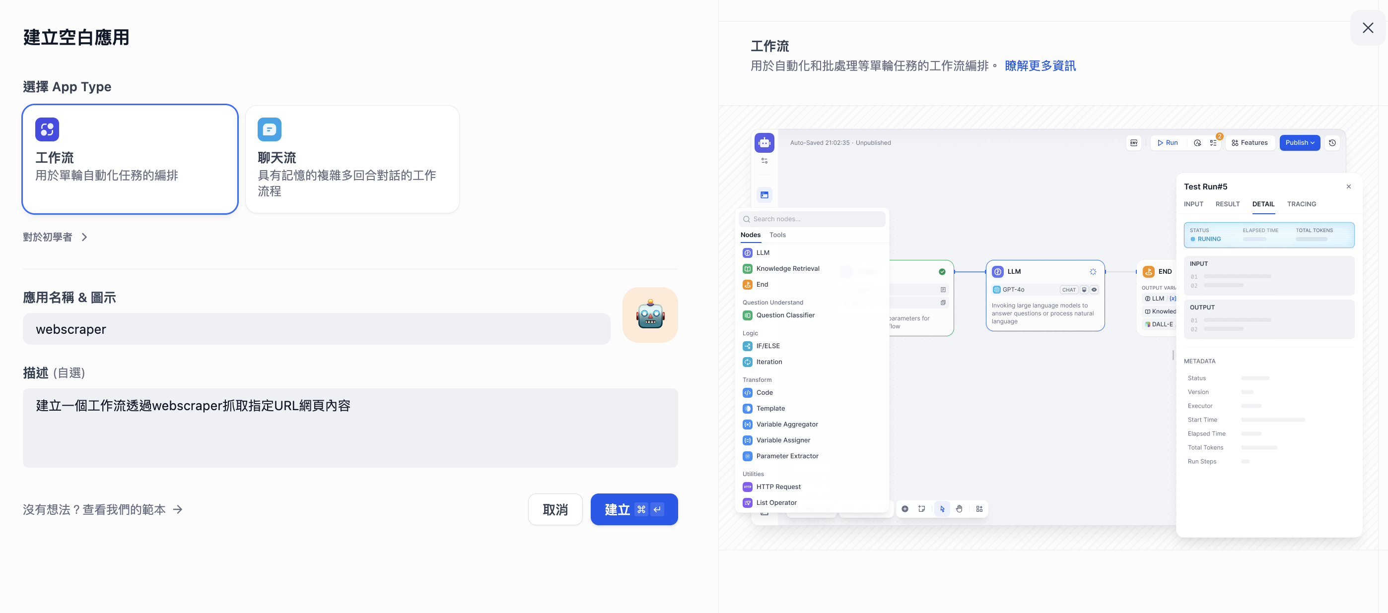 - 建立一個 Dify 工作流(範例:「網頁爬蟲」)