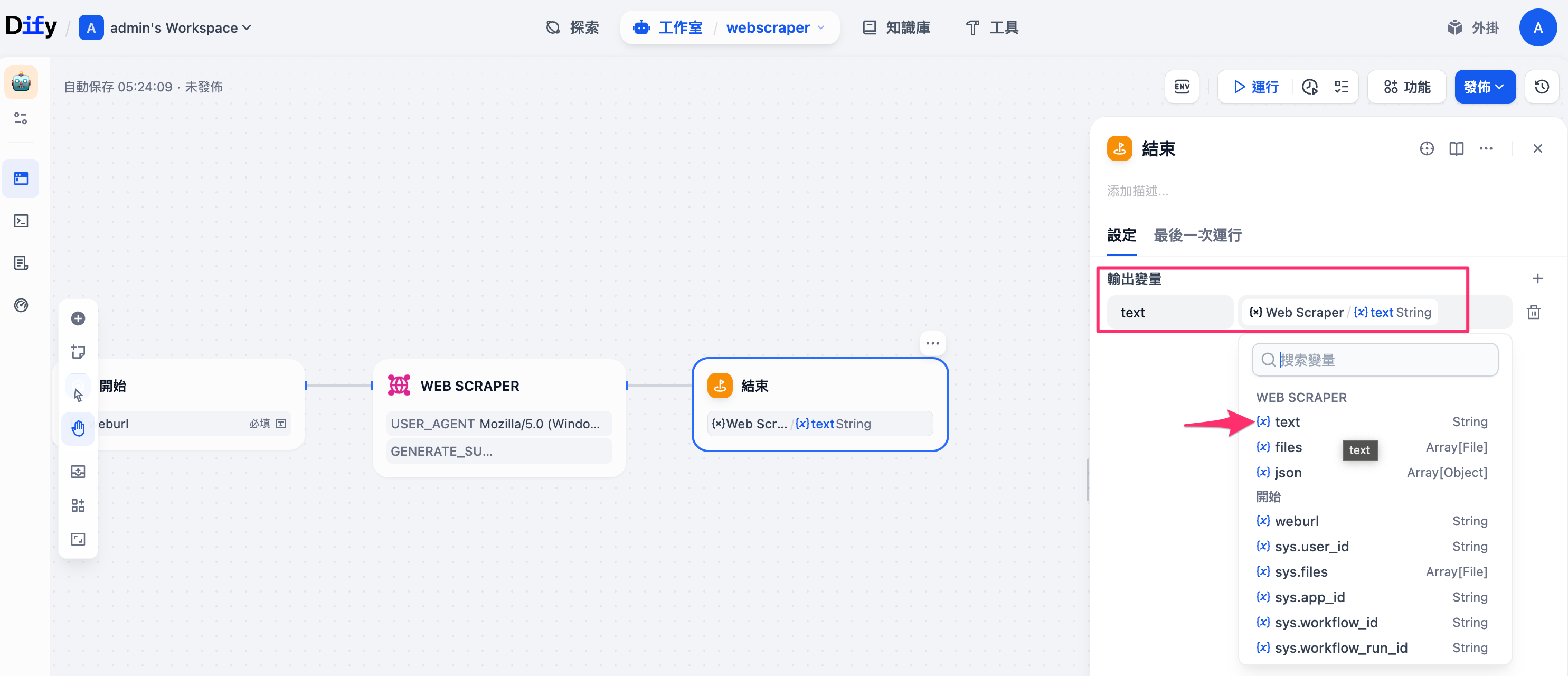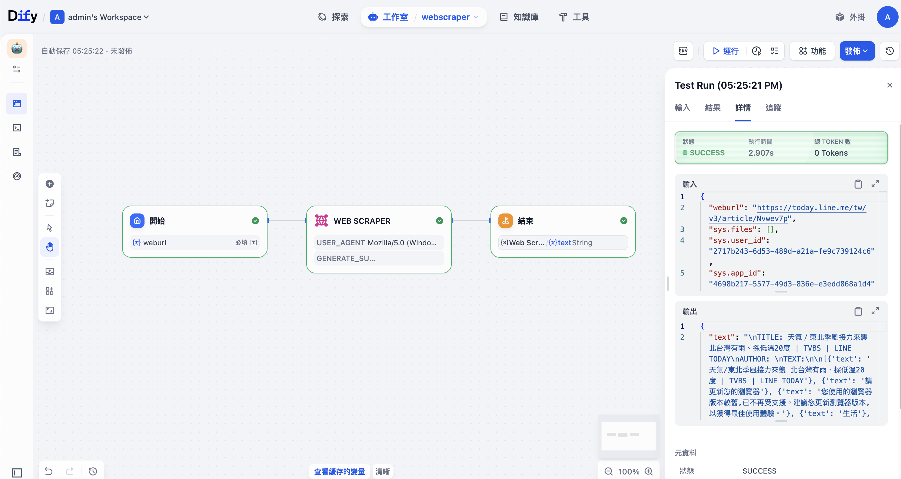 | Web Scraper 工具 | 進行網頁擷取 | 工具類型:webscraper,參數來源:{{#start.weburl#}} |