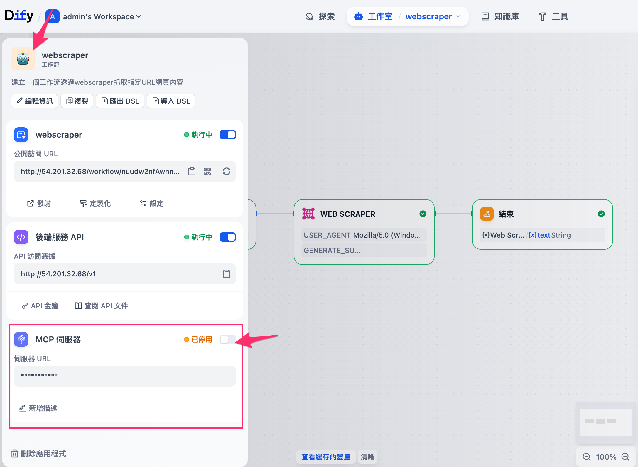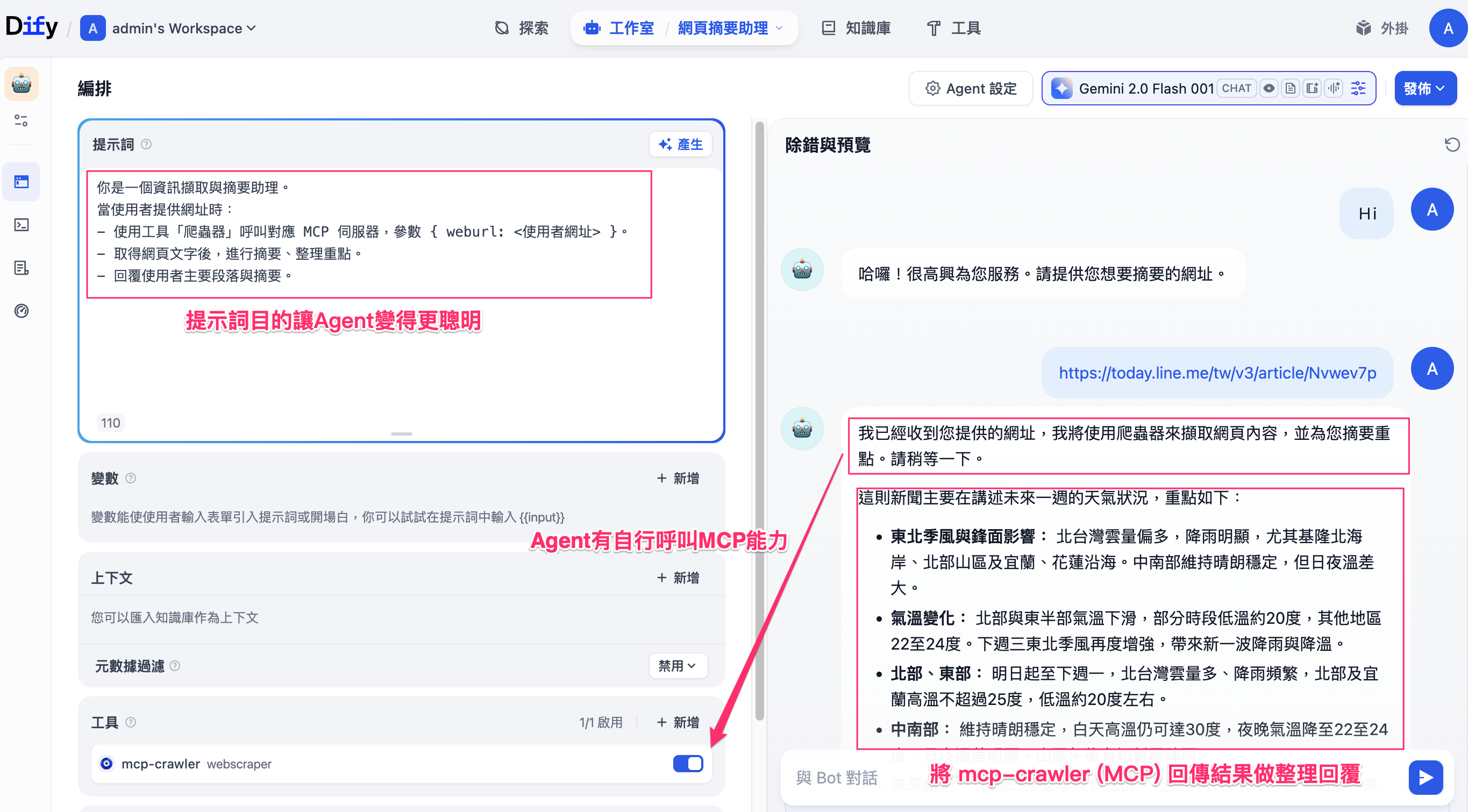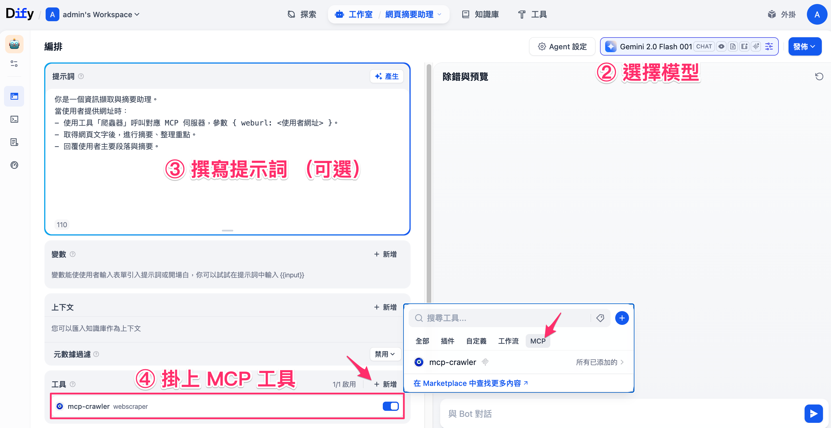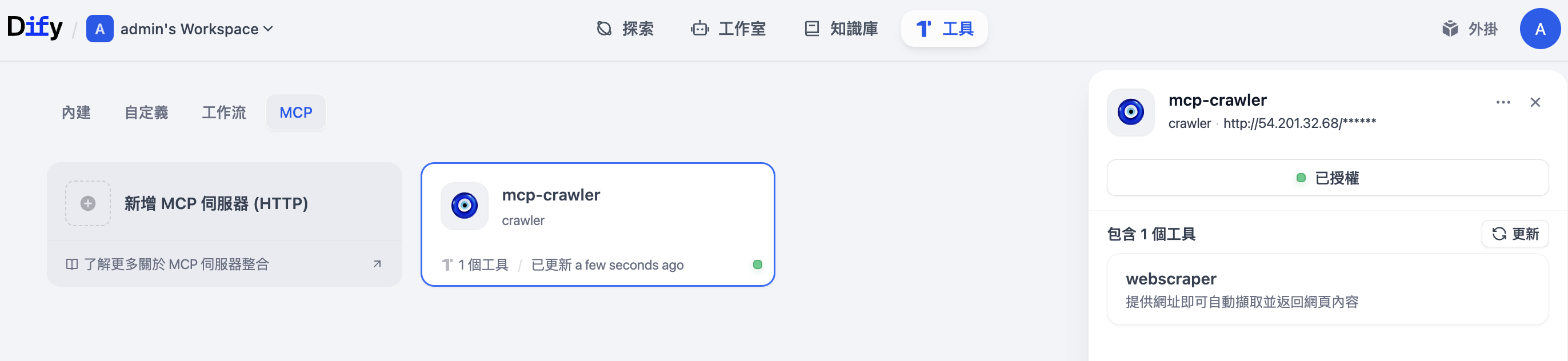 透過集成 MCP 工具,Dify 讓工作流與 Agent 之間的整合變得輕鬆且模組化。不論是內部自行建立的流程(如「網頁爬蟲」),還是跨系統功能,都能快速封裝成一個 MCP Server,讓 Agent 直接以「工具」方式呼叫。