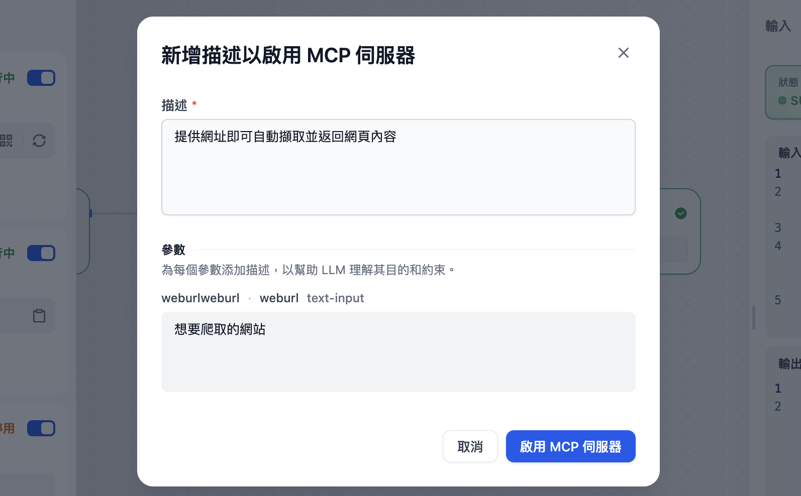 在啟用前,建議為這個 MCP 服務撰寫清楚的說明與參數描述,以幫助 LLM 更準確理解工具用途。