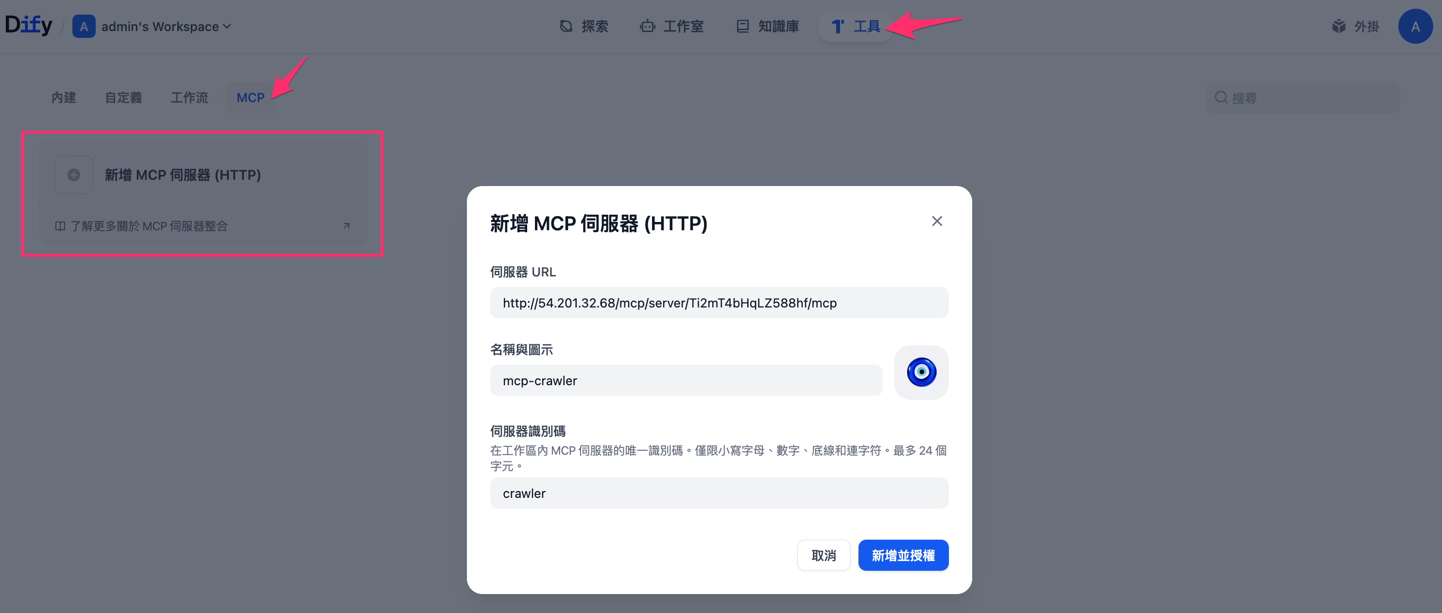 - 在 Dify → 工具 → MCP → 新增 MCP 伺服器 (HTTP)