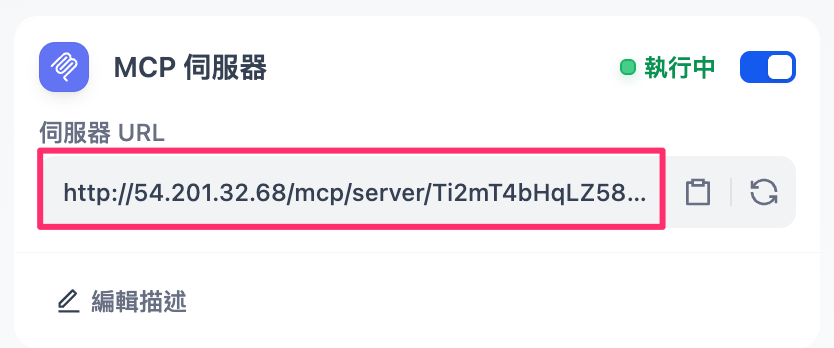 啟用後,系統會自動產生一組 MCP 伺服器 URL,這個連結將作為 Agent 呼叫此工作流的通訊入口。