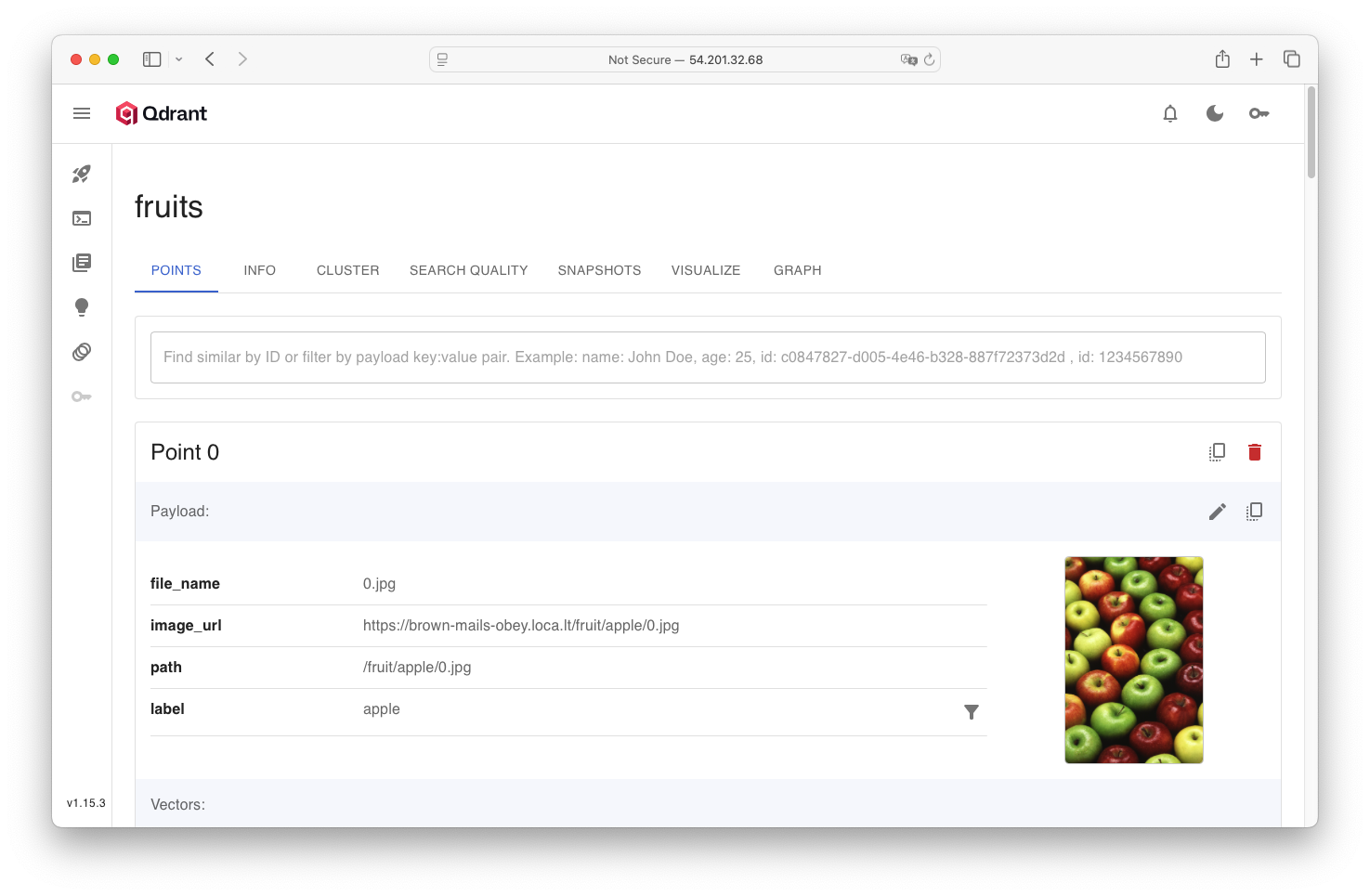 實際效果可參考官方教學影片:YouTube: Visualizing Vector Embeddings: Qdrant’s WebUI Graph Tool 影片內的操作示範,能直接看到同類型圖片自動聚成 cluster,相似圖像集中分佈,支援直觀探索資料集品質與潛在錯誤。