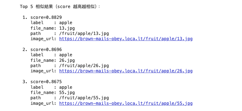client.search()根據 query 向量在 Collection 內做相似度查詢(可加分群/標籤 filter) - 取出前 k 個最相似的圖片(並可取得對應的 score, label, image_url 等資訊)